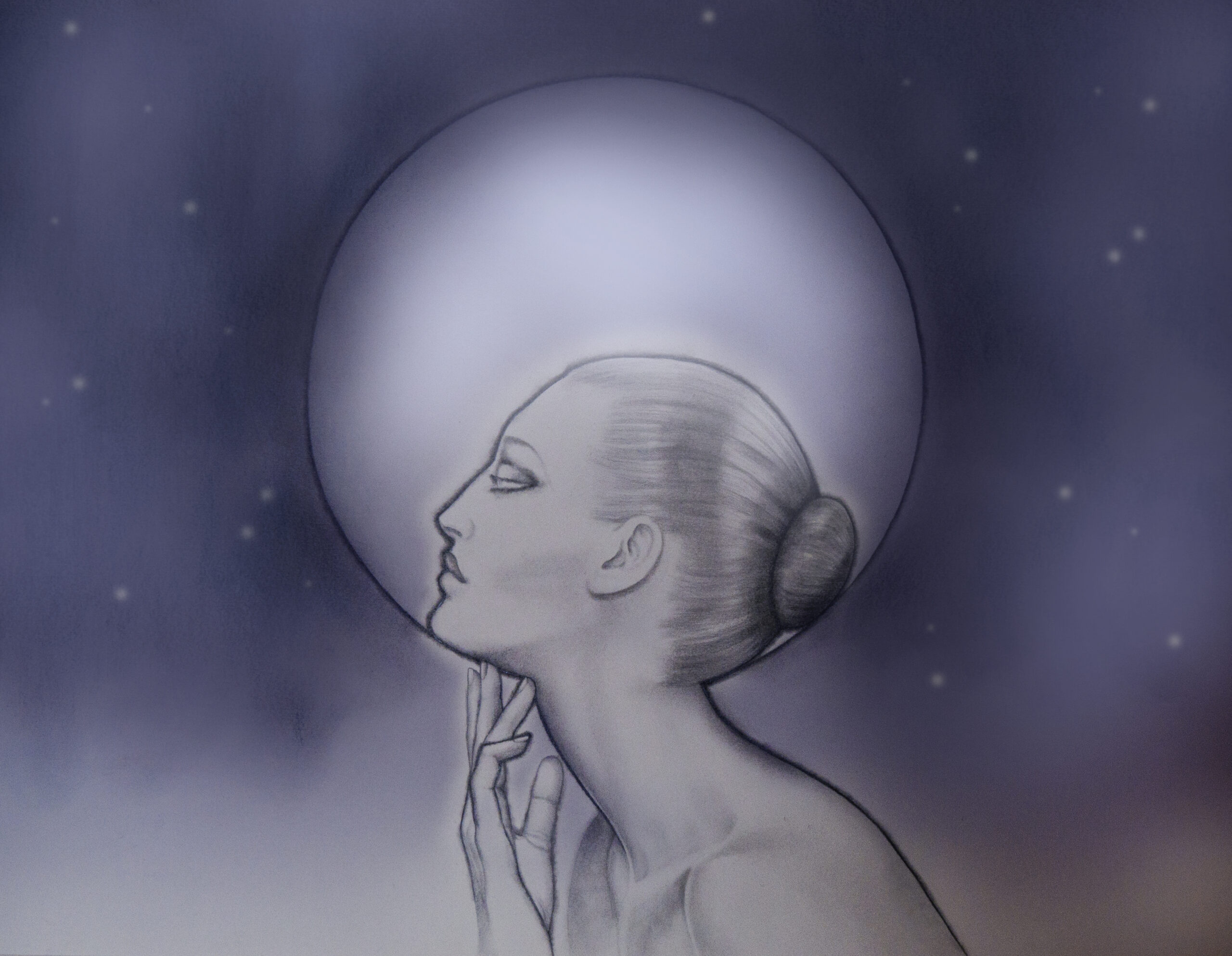 Luna. Print from the original graphite drawing set on a coloured background. Depicts a goddess like, angelic profile against the moon in the night sky. Captivating and elegant.
